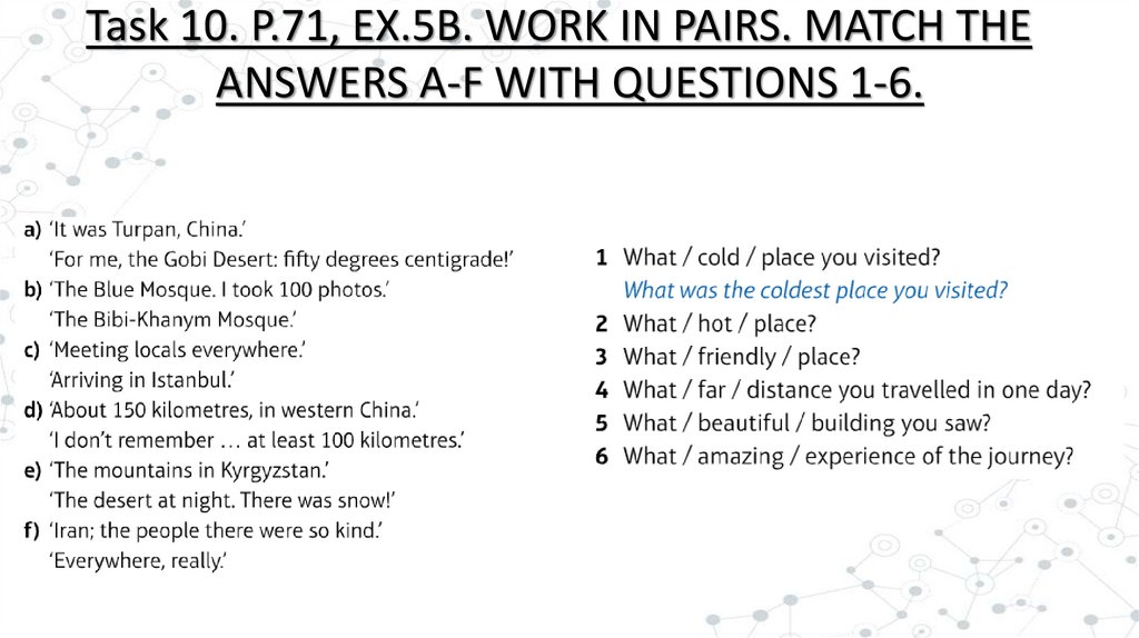 Task 10. P.71, EX.5B. WORK IN PAIRS. MATCH THEANSWERS A-F WITH QUESTIONS 1-6.