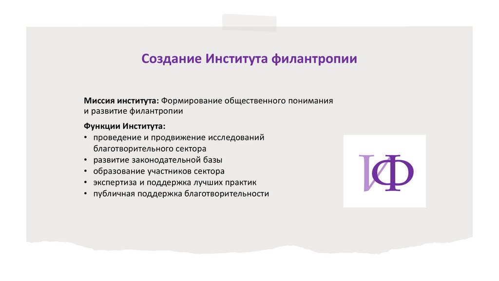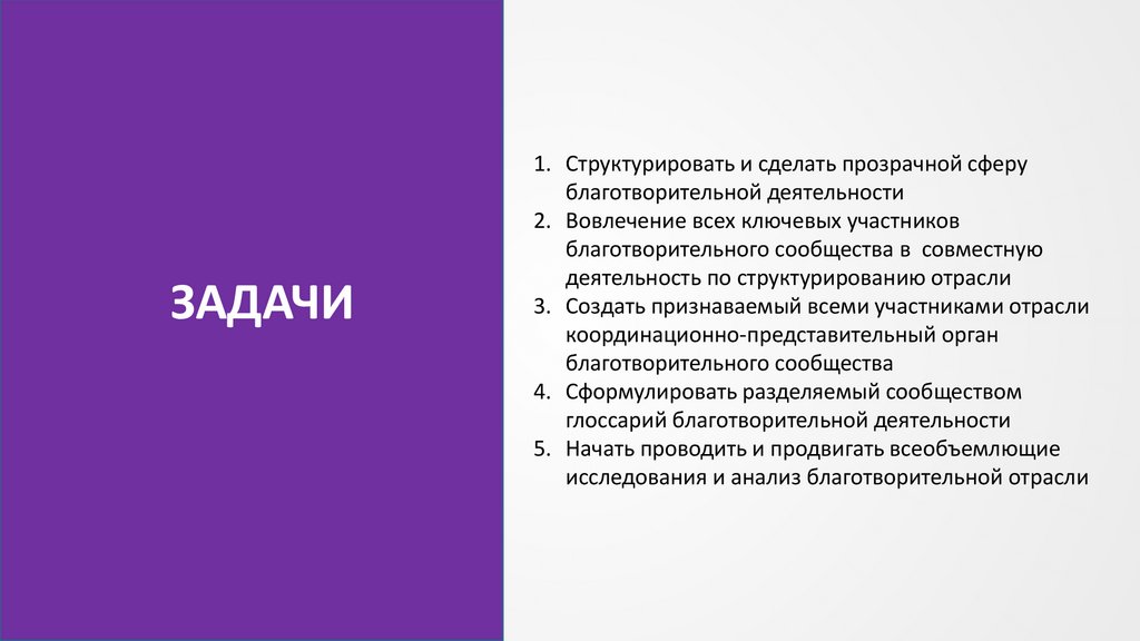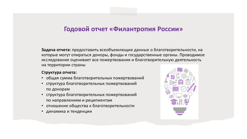 Годовой отчет «Филантропия России»Задача отчета: предоставить всеобъемлющие данные о благотворительности, на