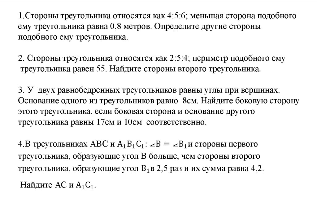 1.Стороны треугольника относятся как 4:5:6; меньшая сторона подобногоему треугольника равна 0,8 метров. Определите другие стороны
