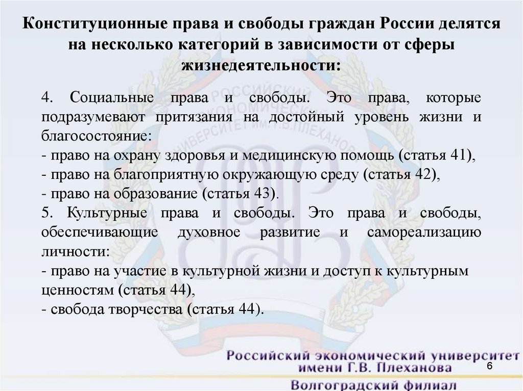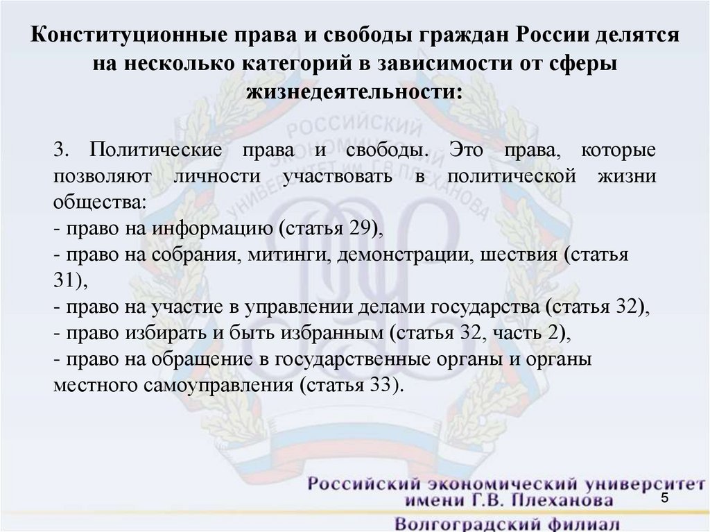 Конституционные права и свободы граждан России делятсяна несколько категорий в зависимости от сферы