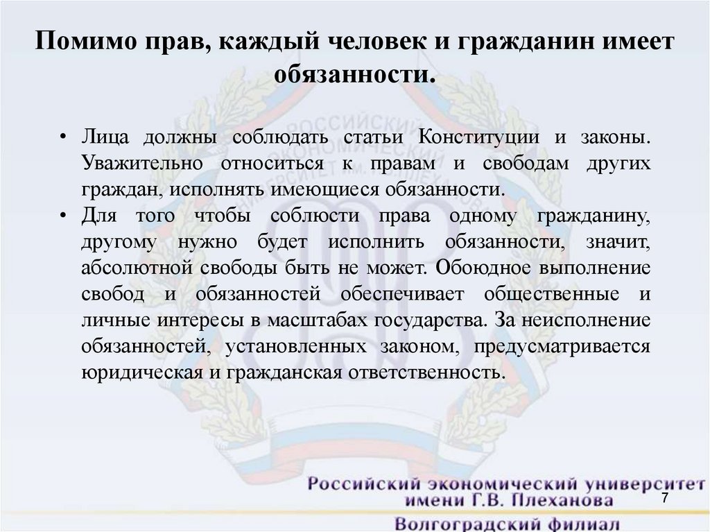 Помимо прав, каждый человек и гражданин имеетобязанности.