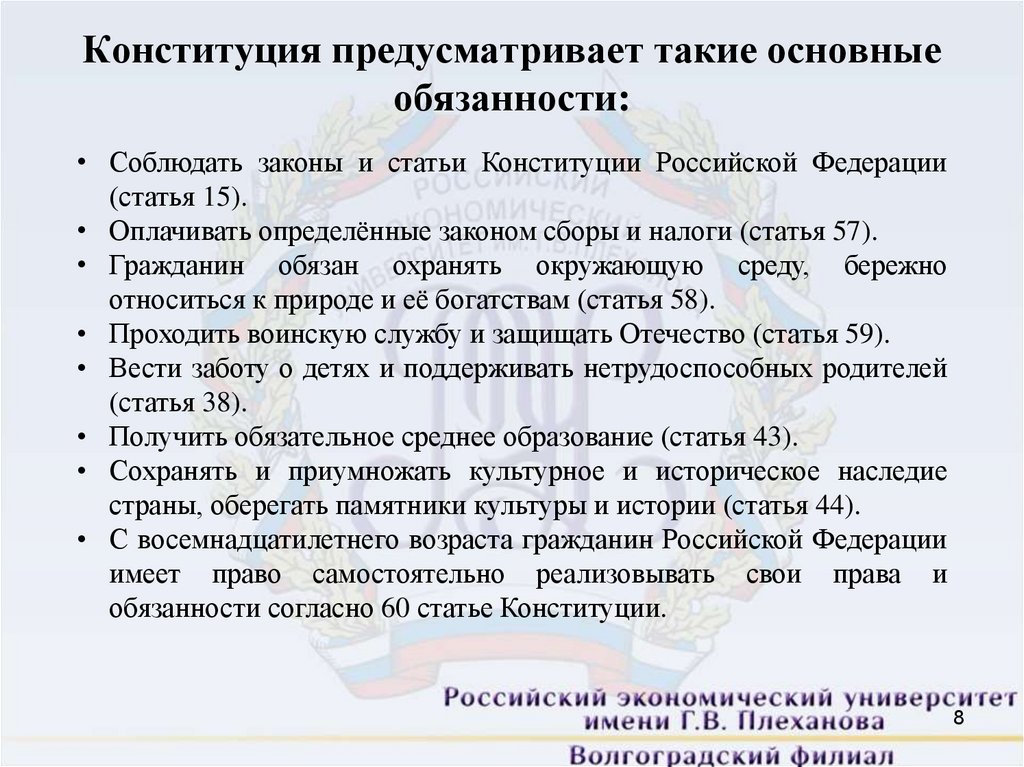 • Соблюдать законы и статьи Конституции Российской Федерации