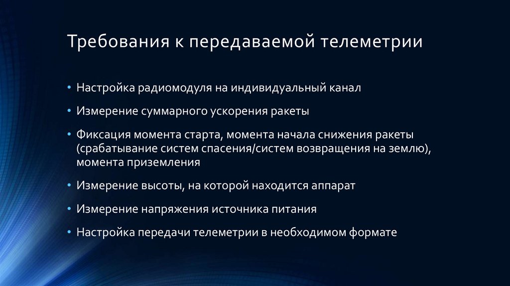 Требования к передаваемой телеметрии• Настройка радиомодуля на индивидуальный канал