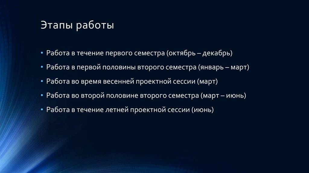 Этапы работы• Работа в течение первого семестра (октябрь – декабрь)