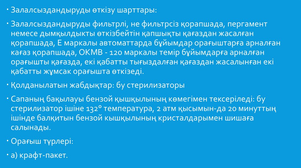Залалсыздандыруды өткізу шарттары:Залалсыздандыруды фильтрлі, не фильтрсіз қорапшада, пергамент