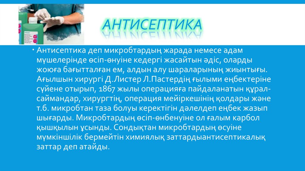 АНТИСЕПТИКААнтисептика деп микробтардың жарада немесе адам