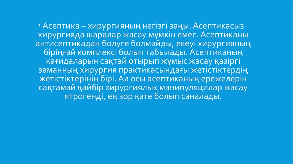 Асептика – хирургияның негізгі заңы. Асептикасызхирургияда шаралар жасау мүмкін емес. Асептиканы