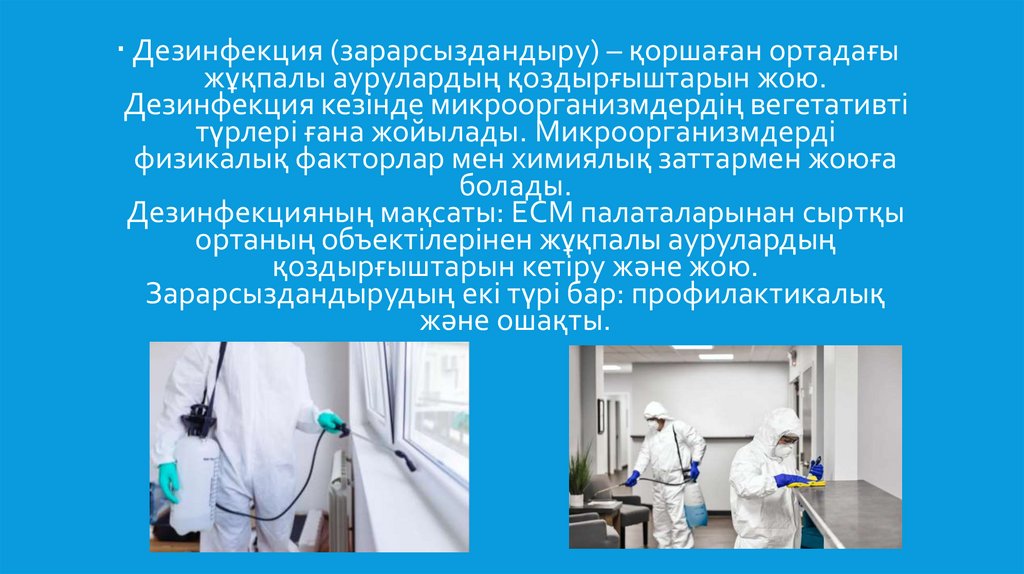 Дезинфекция (зарарсыздандыру) – қоршаған ортадағыжұқпалы аурулардың қоздырғыштарын жою.
