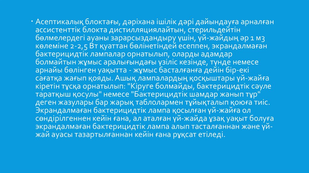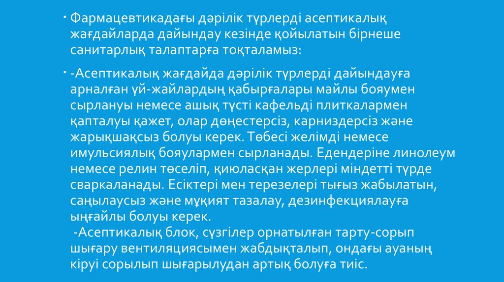 Фармацевтикадағы дәрiлiк түрлердi асептикалықжағдайларда дайындау кезiнде қойылатын бірнеше
