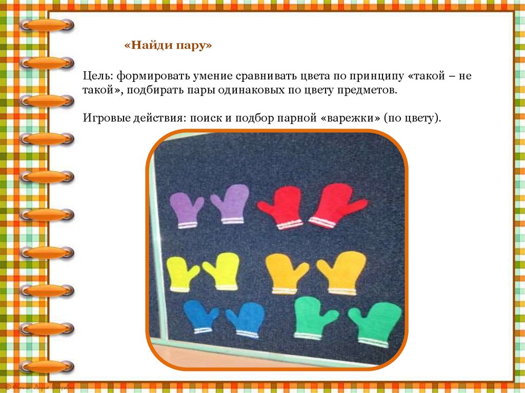 «Найди пару»Цель: формировать умение сравнивать цвета по принципу «такой – не
