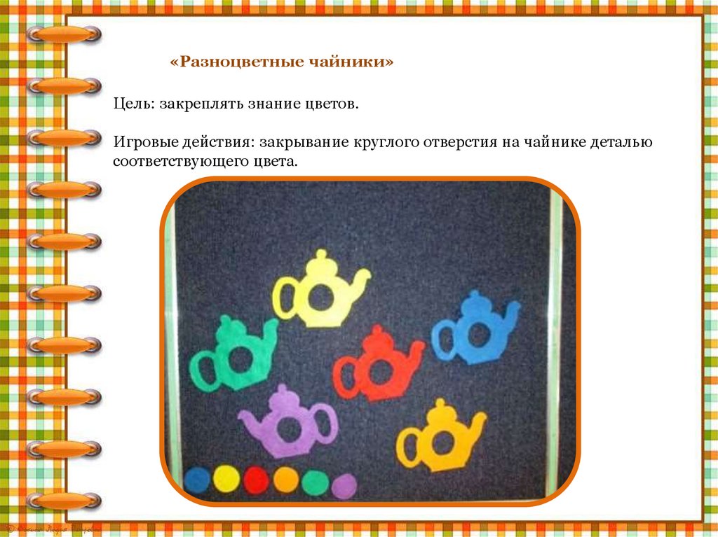 «Разноцветные чайники»Цель: закреплять знание цветов.