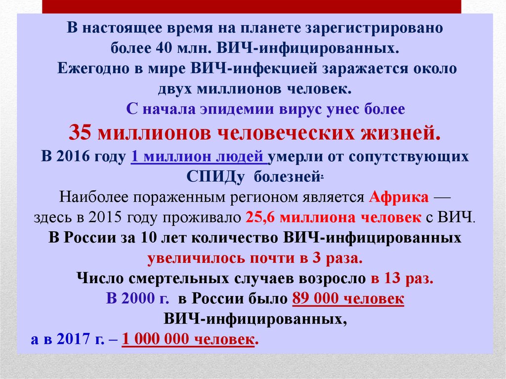 В настоящее время на планете зарегистрированоболее 40 млн. ВИЧ-инфицированных.