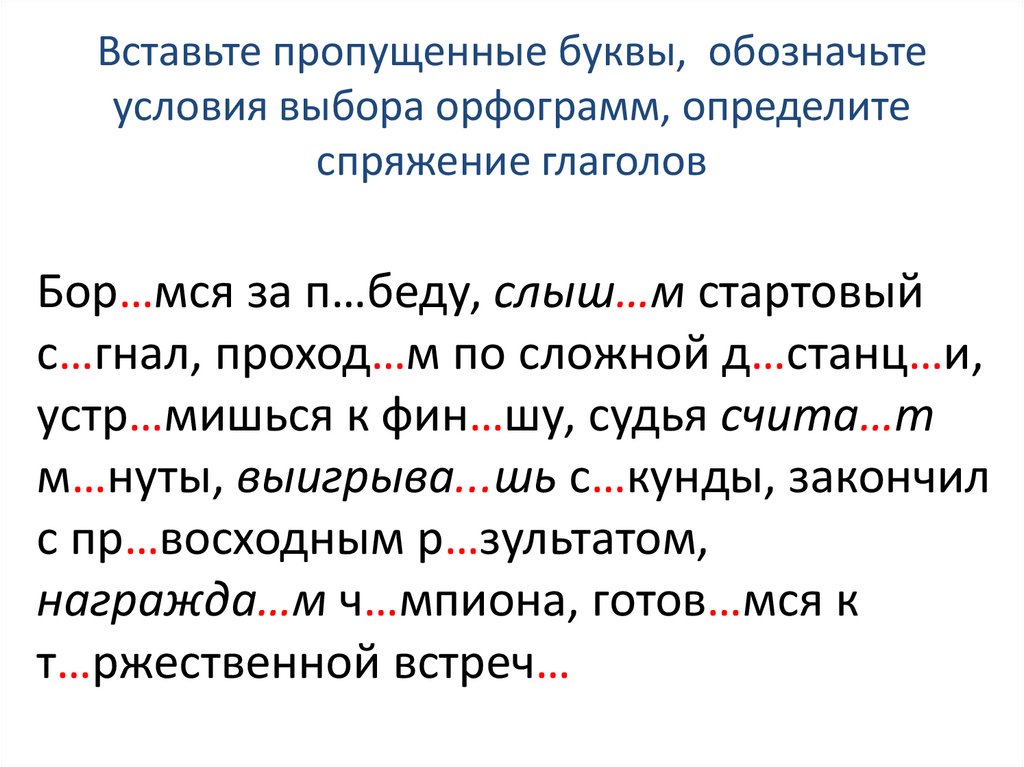 Вставьте пропущенные буквы, обозначьтеусловия выбора орфограмм, определите