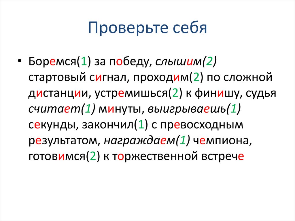 Проверьте себя• Боремся(1) за победу, слышим(2)