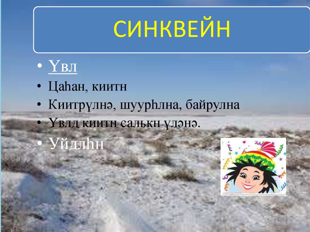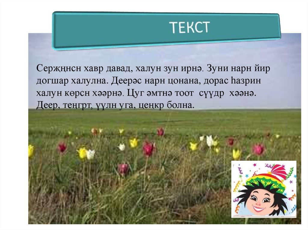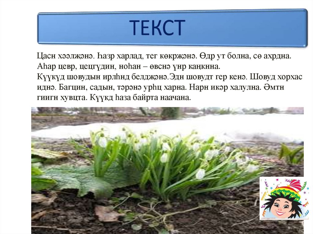 Цасн хәәлҗәнә. Һазр харлад, тег көкрҗәнә. Өдр ут болна, сө ахрдна.Аhар цевр, цецгүдин, ноhан – өвснә үнр каӊкнна.