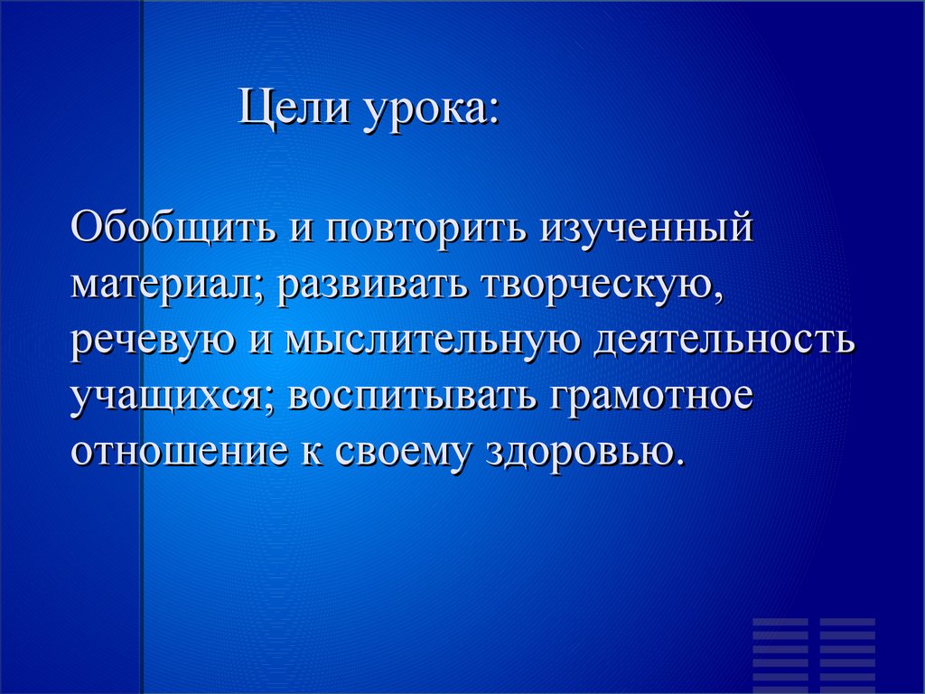 Цели урока:Обобщить и повторить изученный