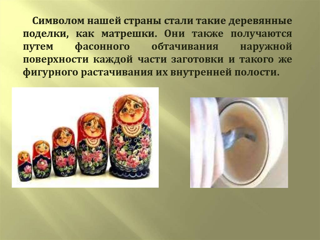 Символом нашей страны стали такие деревянныеподелки, как матрешки. Они также получаются