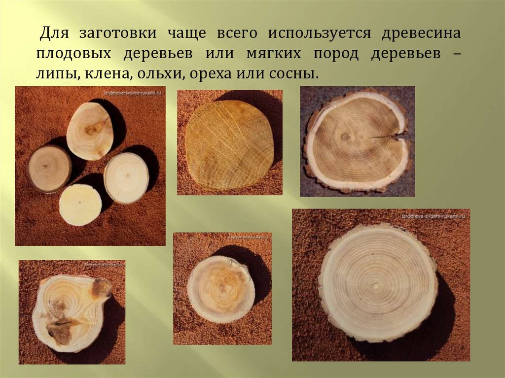 Для заготовки чаще всего используется древесинаплодовых деревьев или мягких пород деревьев –