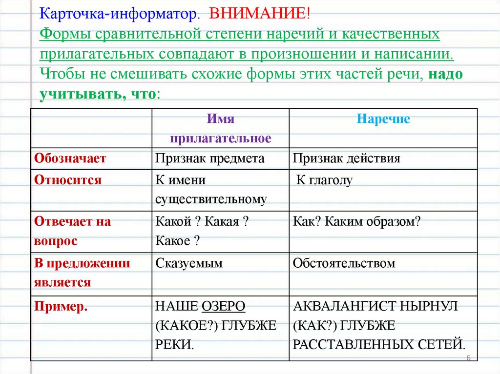 Карточка-информатор. ВНИМАНИЕ!Формы сравнительной степени наречий и качественных