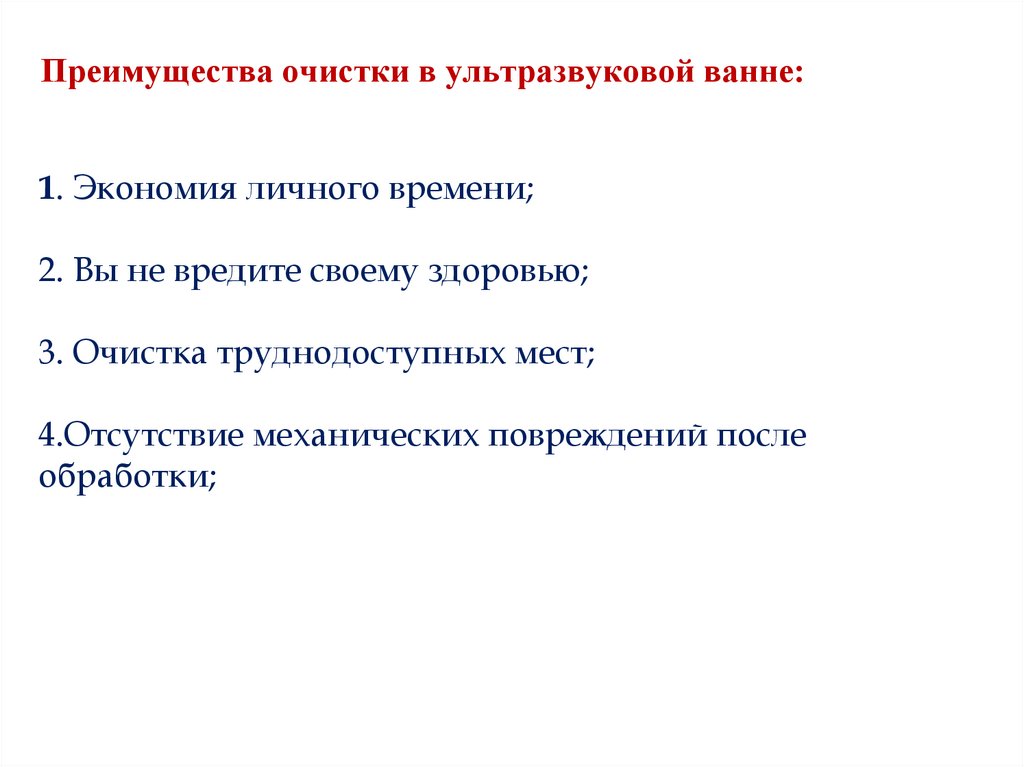 Преимущества очистки в ультразвуковой ванне:1. Экономия личного времени;