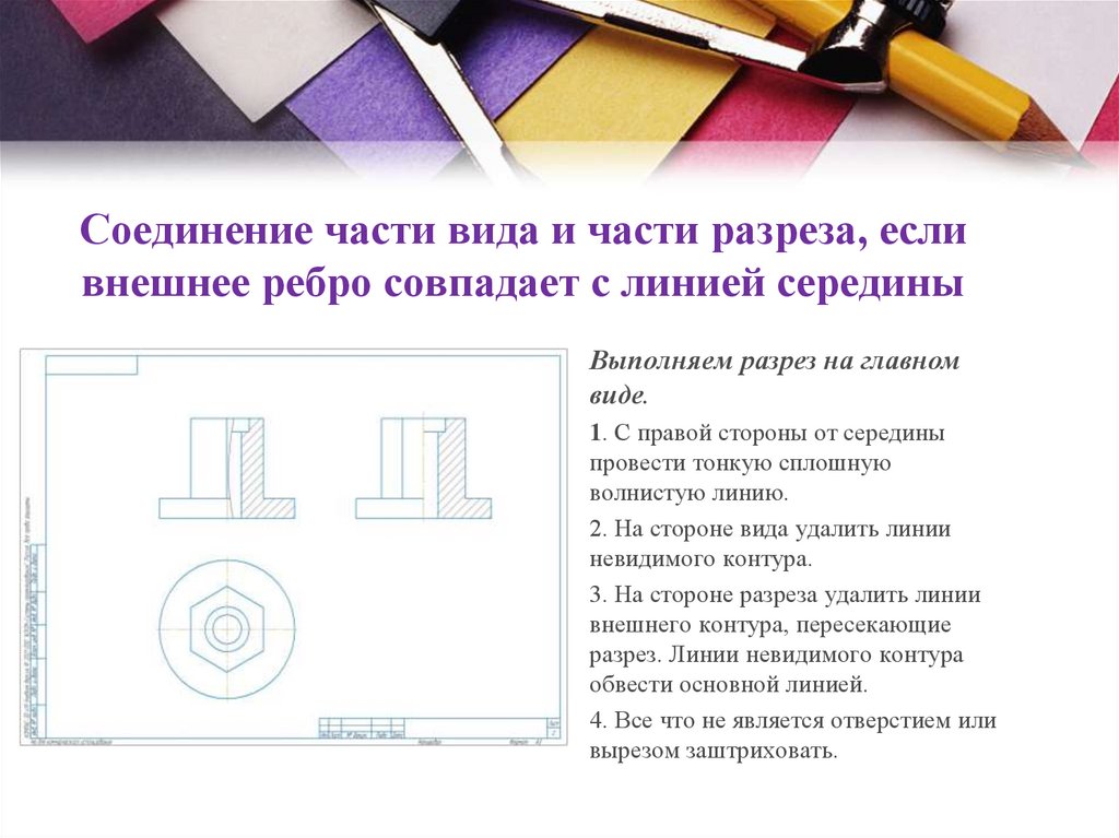 Соединение части вида и части разреза, есливнешнее ребро совпадает с линией середины