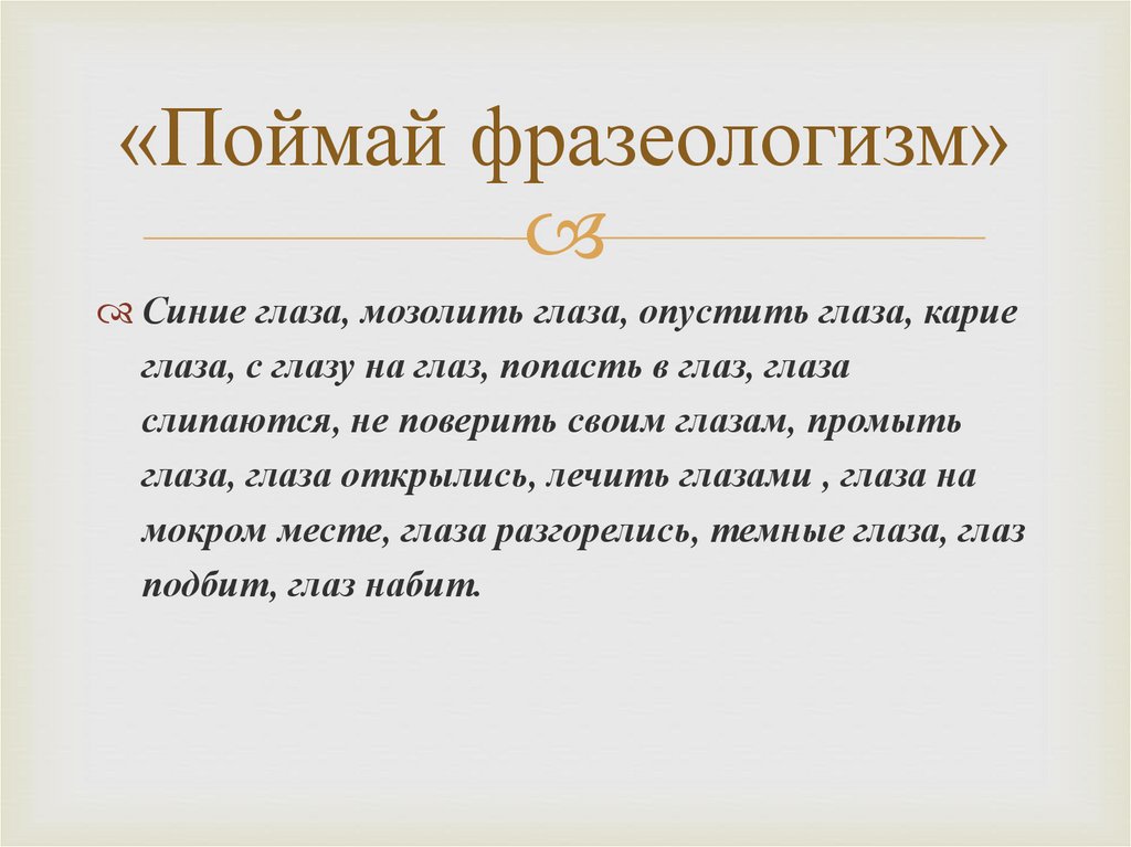 «Поймай фразеологизм»Синие глаза, мозолить глаза, опустить глаза, карие