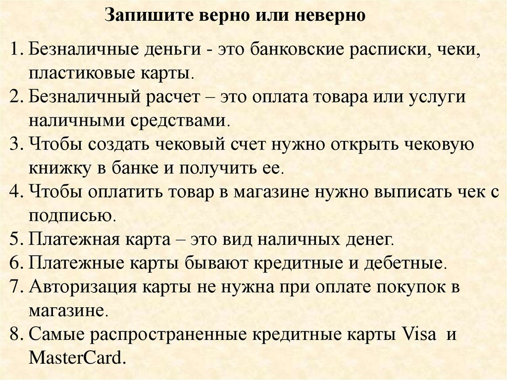 Запишите верно или неверно1. Безналичные деньги - это банковские расписки, чеки,