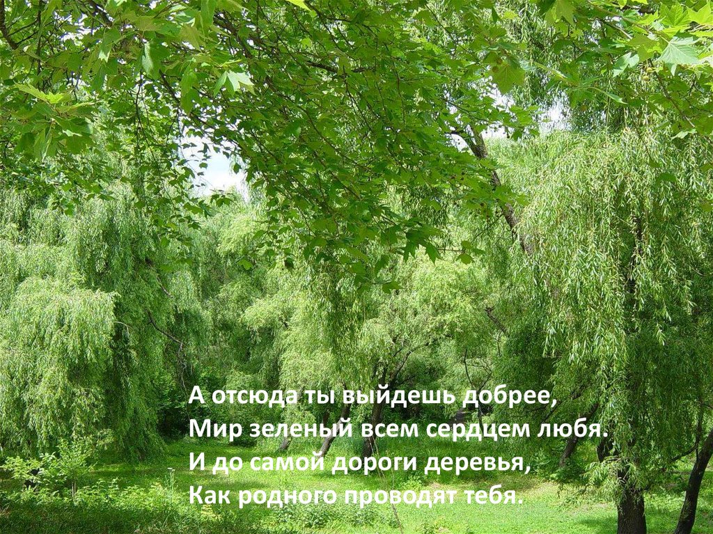 А отсюда ты выйдешь добрее,Мир зеленый всем сердцем любя.