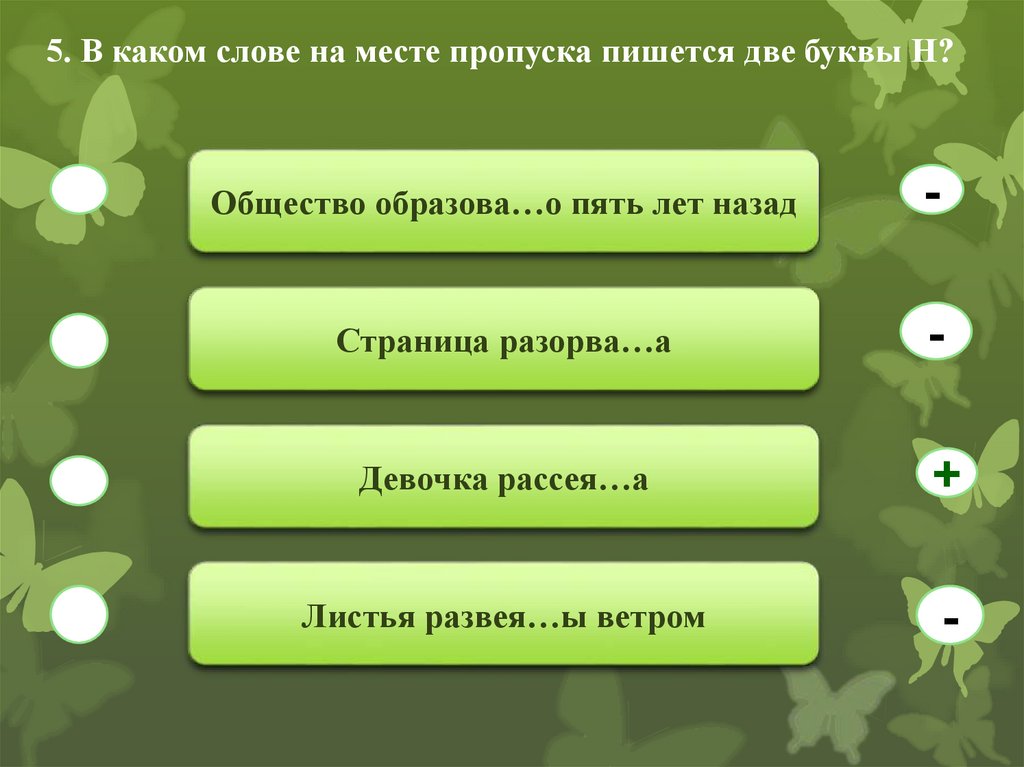 5. В каком слове на месте пропуска пишется две буквы Н?Общество образова…о пять лет назад