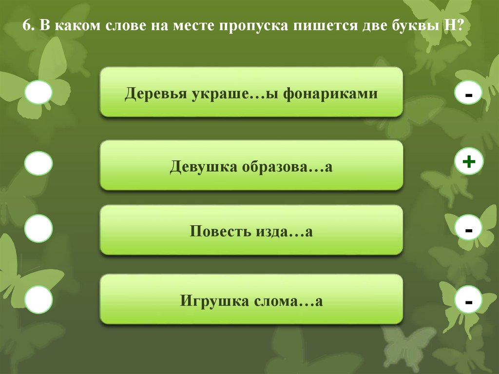 6. В каком слове на месте пропуска пишется две буквы Н?Деревья украше…ы фонариками
