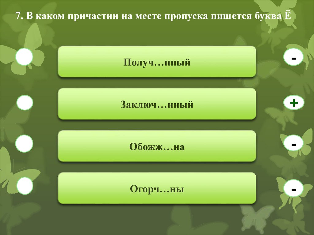 7. В каком причастии на месте пропуска пишется буква ЁПолуч…нный