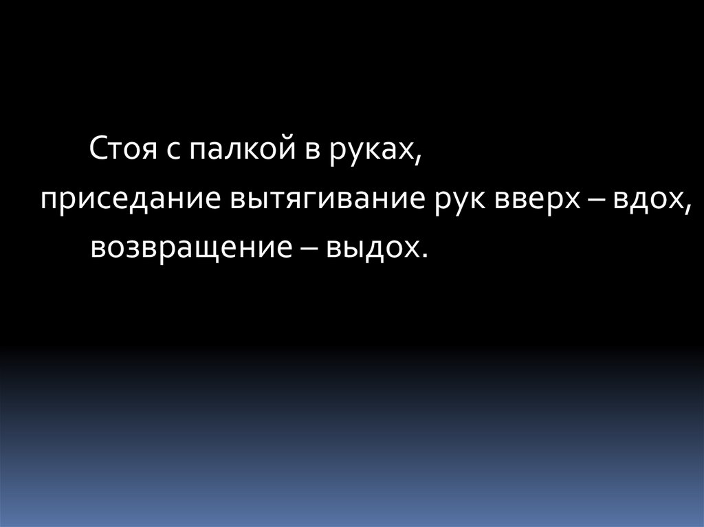 Стоя с палкой в руках,приседание вытягивание рук вверх – вдох,