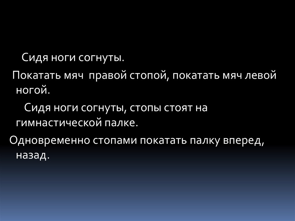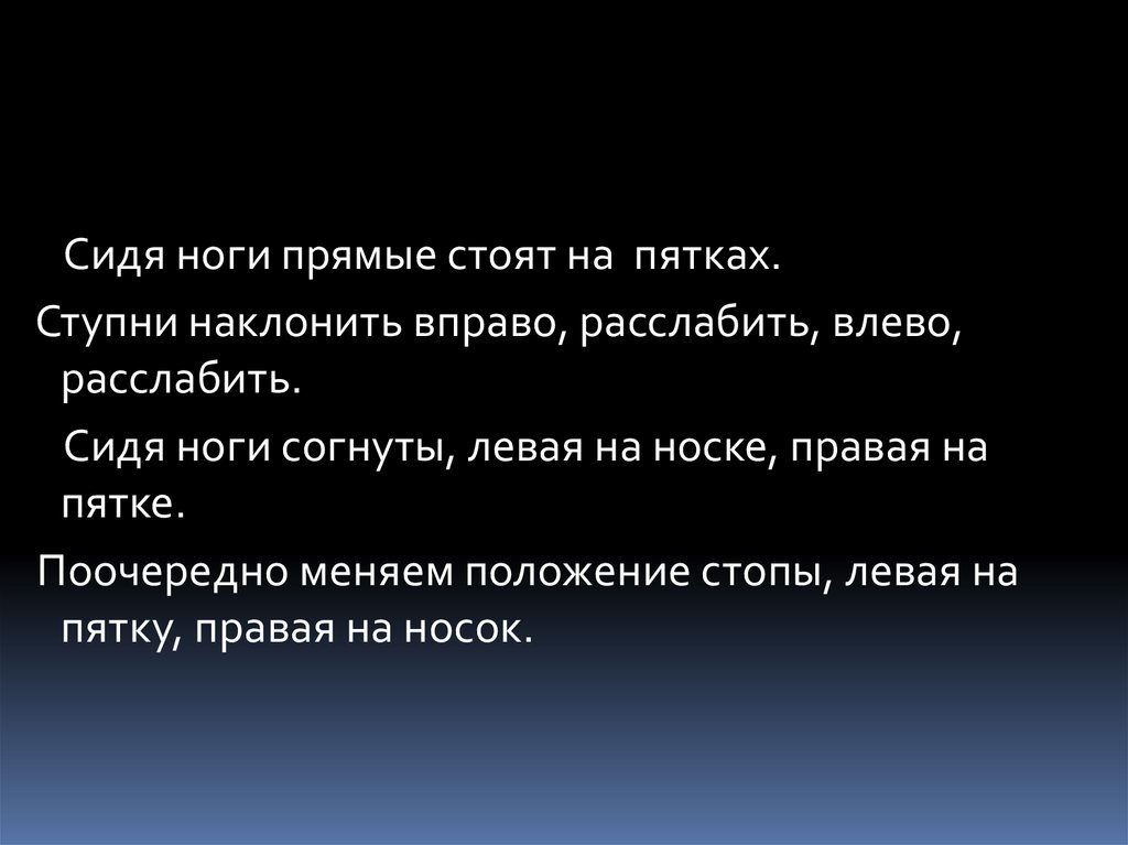 Сидя ноги прямые стоят на пятках.Ступни наклонить вправо, расслабить, влево,