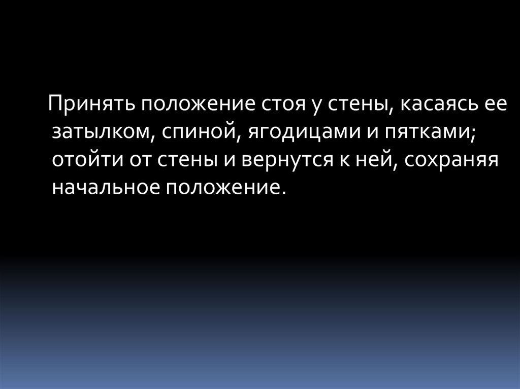 Принять положение стоя у стены, касаясь еезатылком, спиной, ягодицами и пятками;