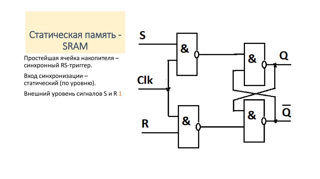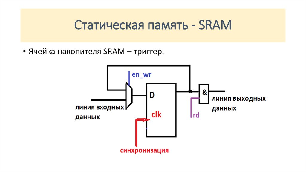 Статическая память - SRAM• Ячейка накопителя SRAM – триггер.