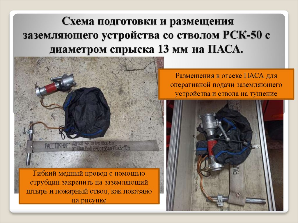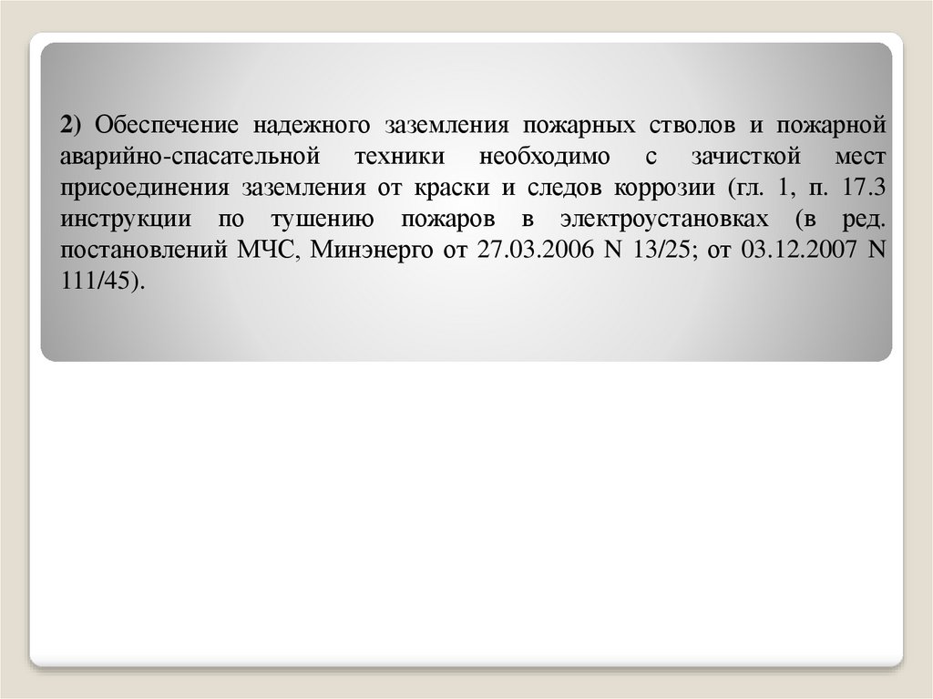 2) Обеспечение надежного заземления пожарных стволов и пожарнойаварийно-спасательной техники необходимо с зачисткой мест