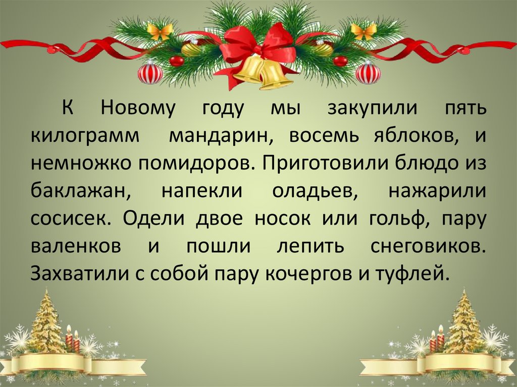 К Новому году мы закупили пятькилограмм мандарин, восемь яблоков, и