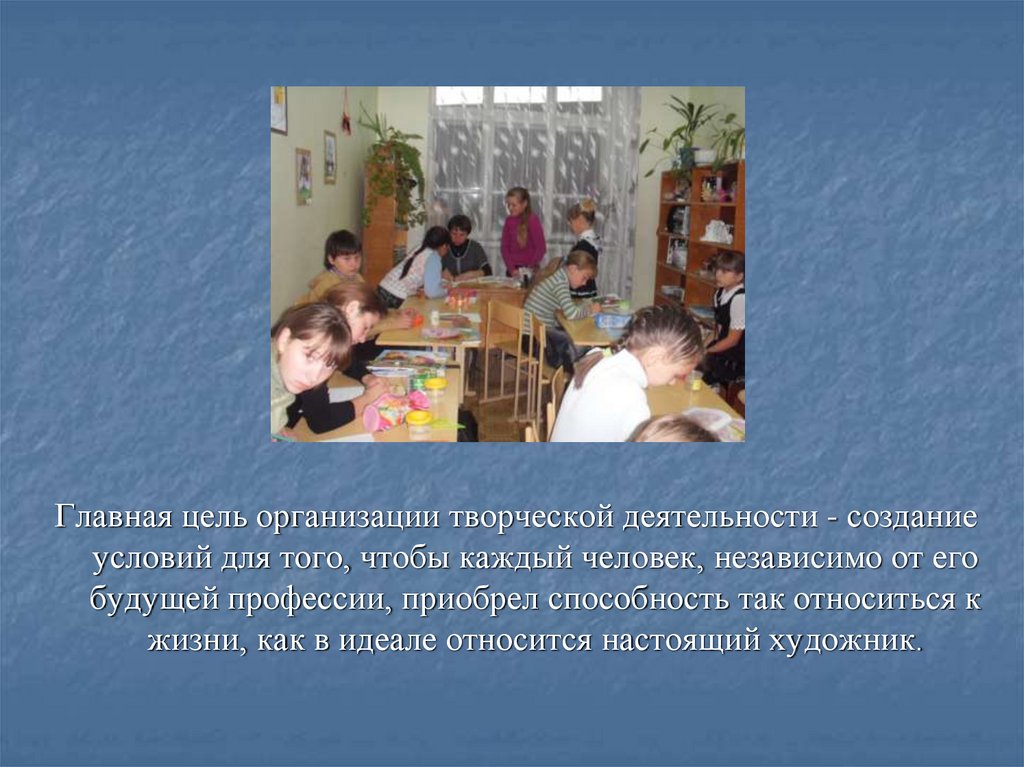 Главная цель организации творческой деятельности - созданиеусловий для того, чтобы каждый человек, независимо от его