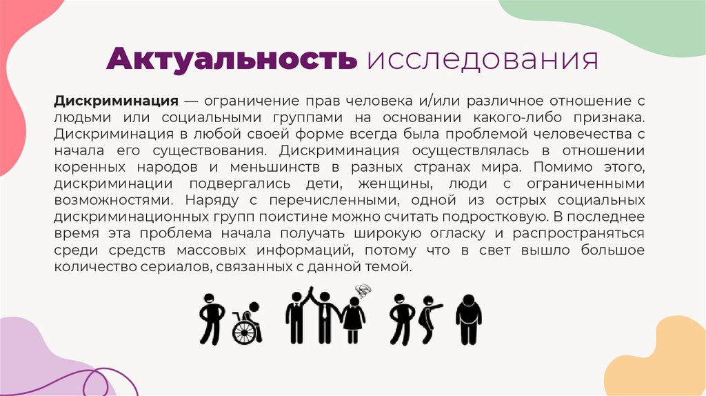 Актуальность исследованияДискриминация — ограничение прав человека и/или различное отношение с