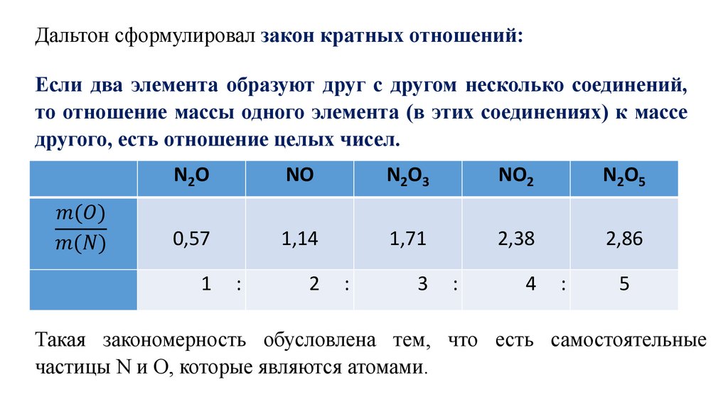 Дальтон сформулировал закон кратных отношений:Если два элемента образуют друг с другом несколько соединений,