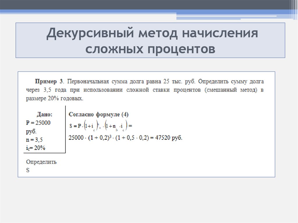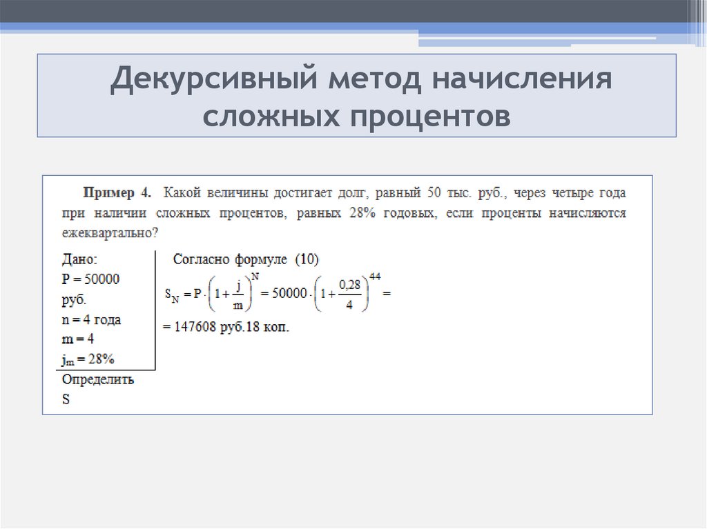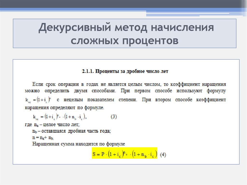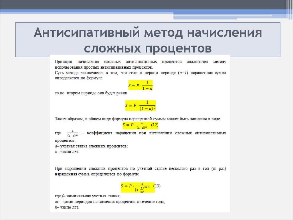 Как и при простых процентах различают антисипативный и декурсивный методы