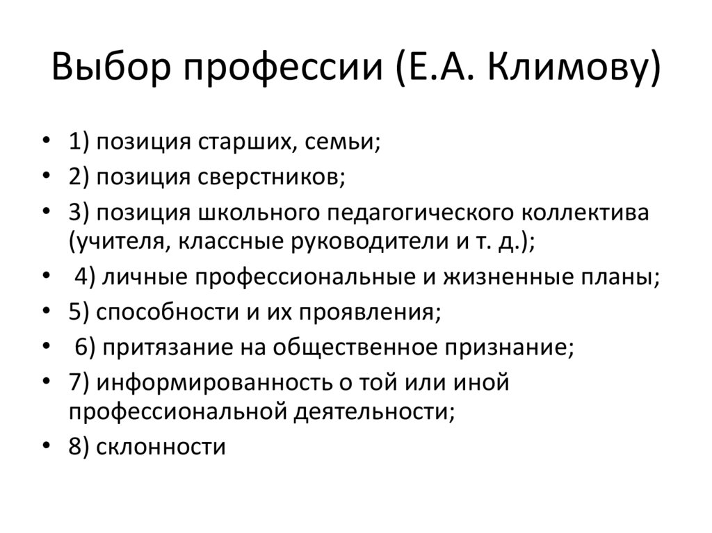 Выбор профессии (Е.А. Климову)• 1) позиция старших, семьи;