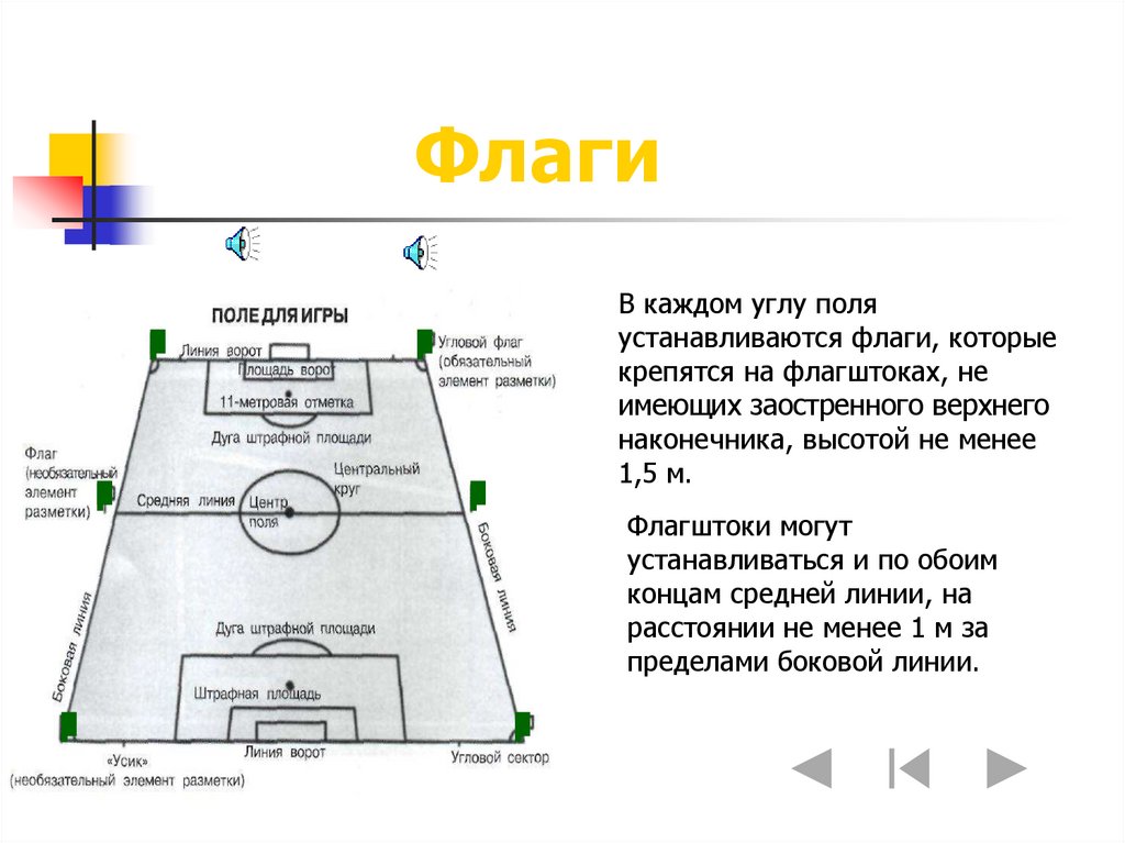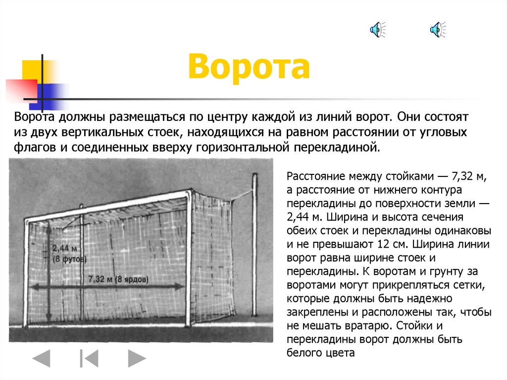 ВоротаВорота должны размещаться по центру каждой из линий ворот. Они состоят