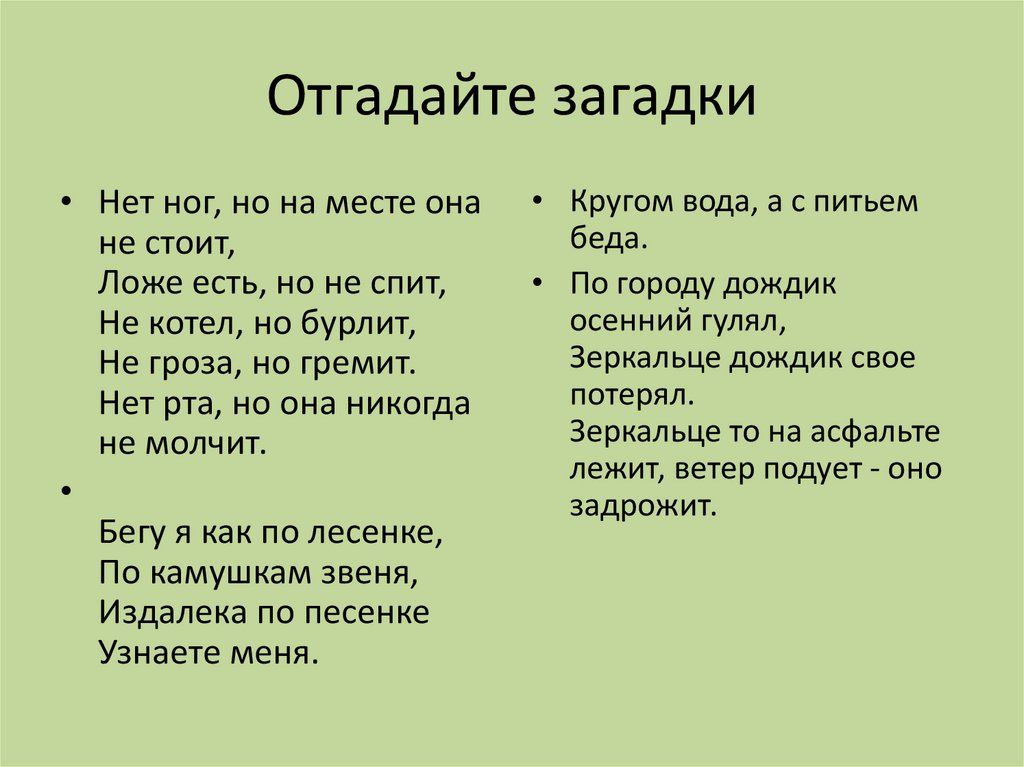 Отгадайте загадки• Нет ног, но на месте она