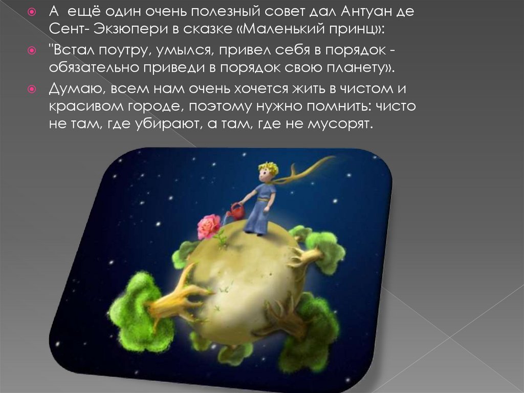 А ещё один очень полезный совет дал Антуан деСент- Экзюпери в сказке «Маленький принц»: