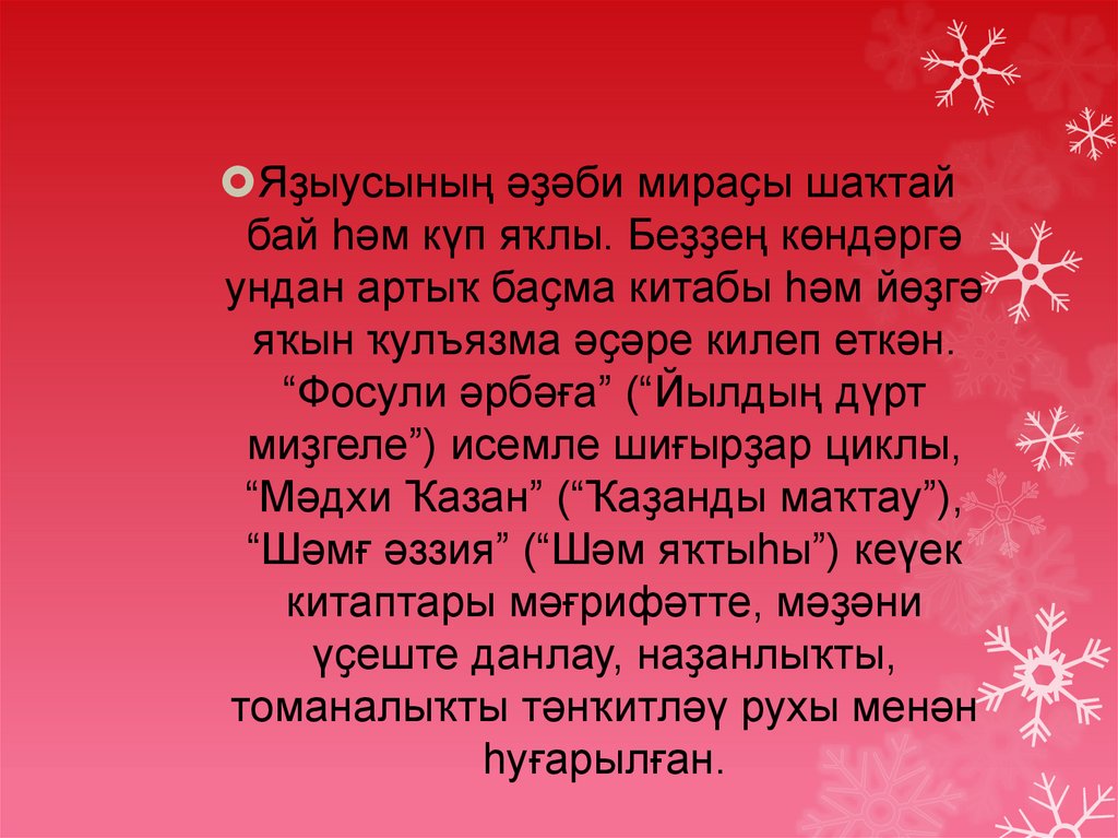 Яҙыусының әҙәби мираҫы шаҡтайбай һәм күп яҡлы. Беҙҙең көндәргә