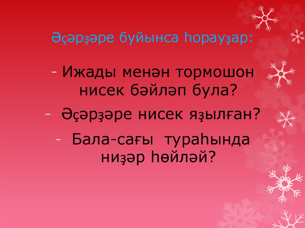 Әҫәрҙәре буйынса һорауҙар:- Ижады менән тормошон