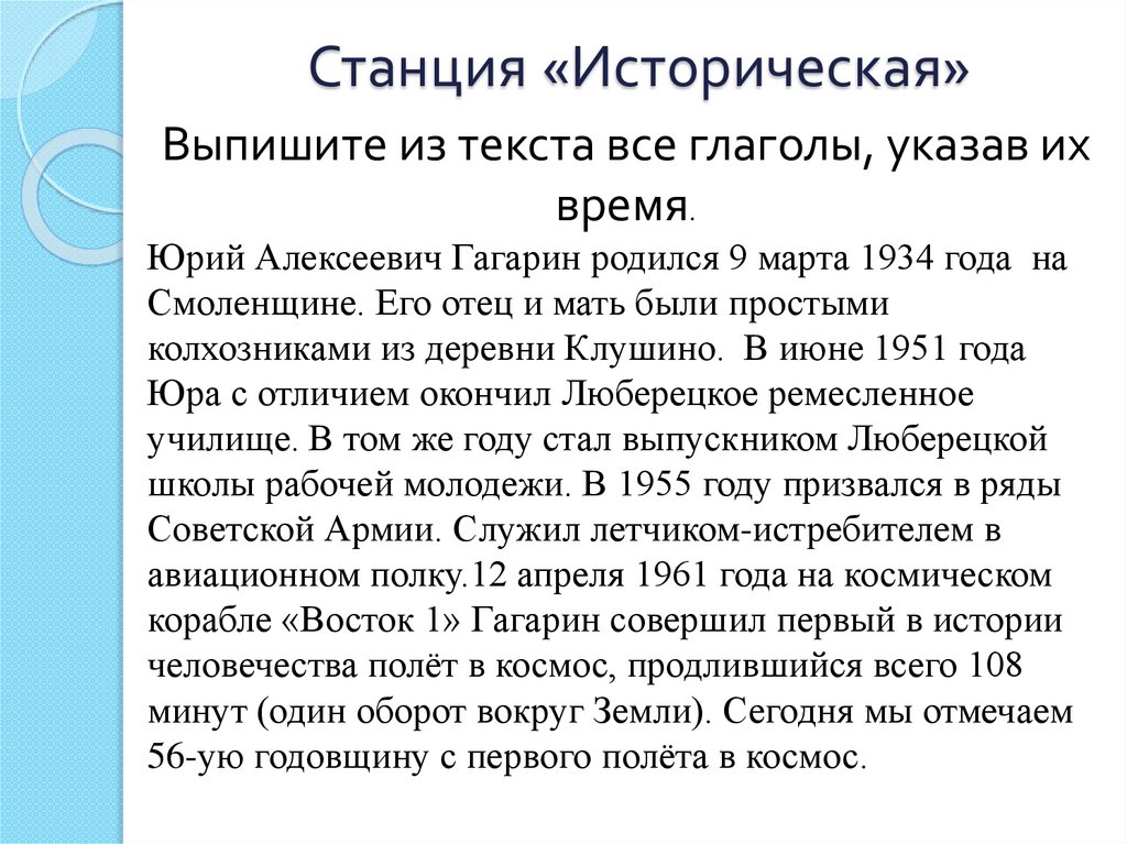 Станция «Историческая»Выпишите из текста все глаголы, указав их