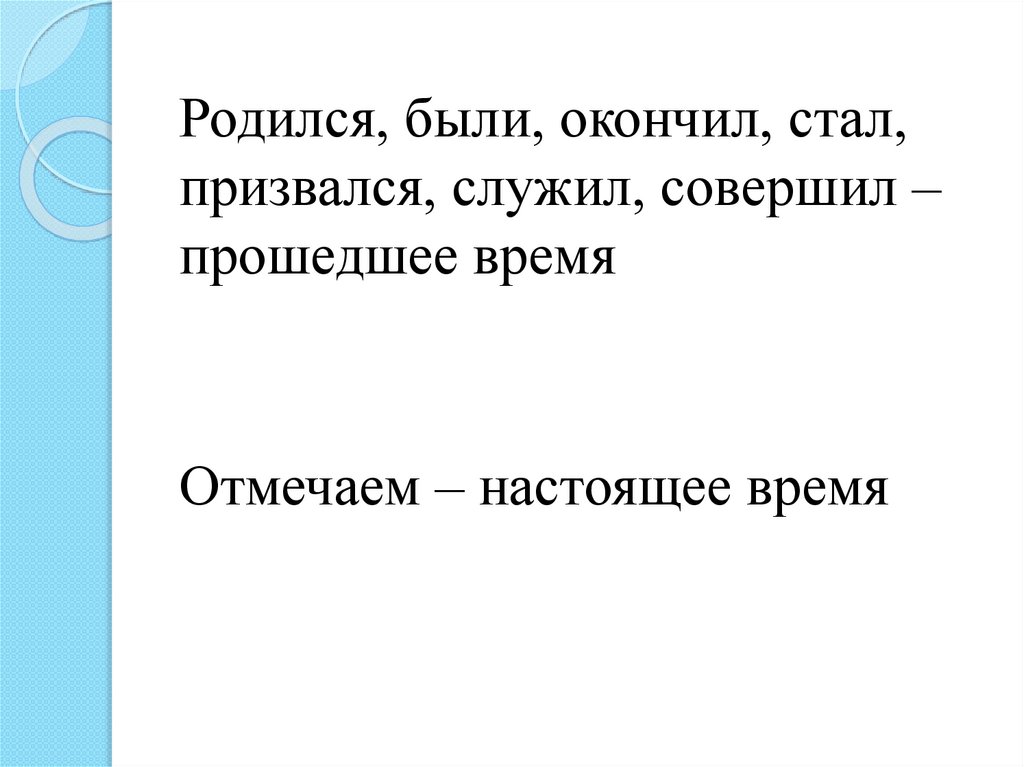Родился, были, окончил, стал,призвался, служил, совершил –