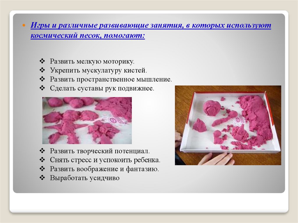 Игры и различные развивающие занятия, в которых используюткосмический песок, помогают: